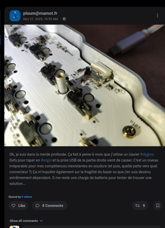 This post will be shared to my Fediverse audience through my @ploum@mamot.fr Mastodon account. But Pixelfed users will not see it. Even if they follow me, even if many people they follow boost it. Instead, they will see a picture of my broken keyboard that I posted a week ago.